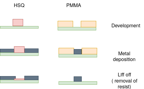PMMA is selected over HSQ for this project on the basis of lift-off compatibility. The fabrication process requires metal deposition followed by resist lift-off to define the metallic grid features. As a positive resist, PMMA produces an undercut profile during development that allows clean separation of the deposited metal film [11] [12]. HSQ, as a negative resist, produces an overcut profile that prevents clean lift-off and is therefore incompatible with this process flow [13].